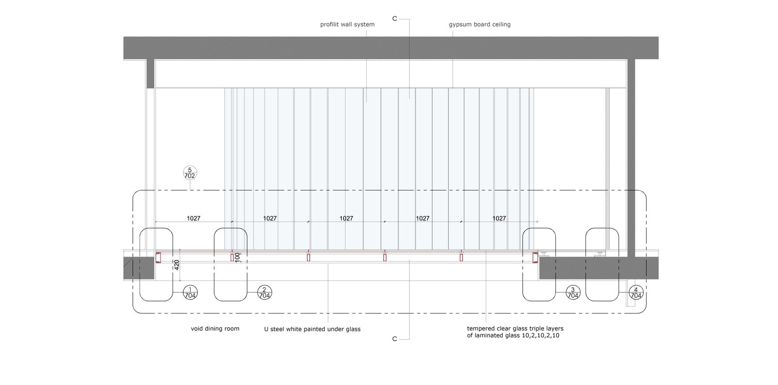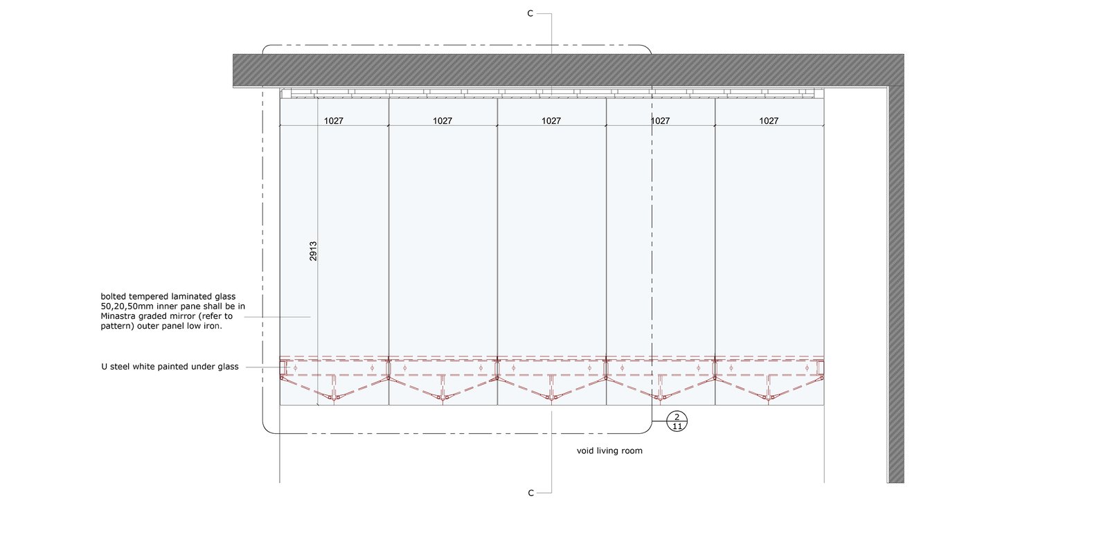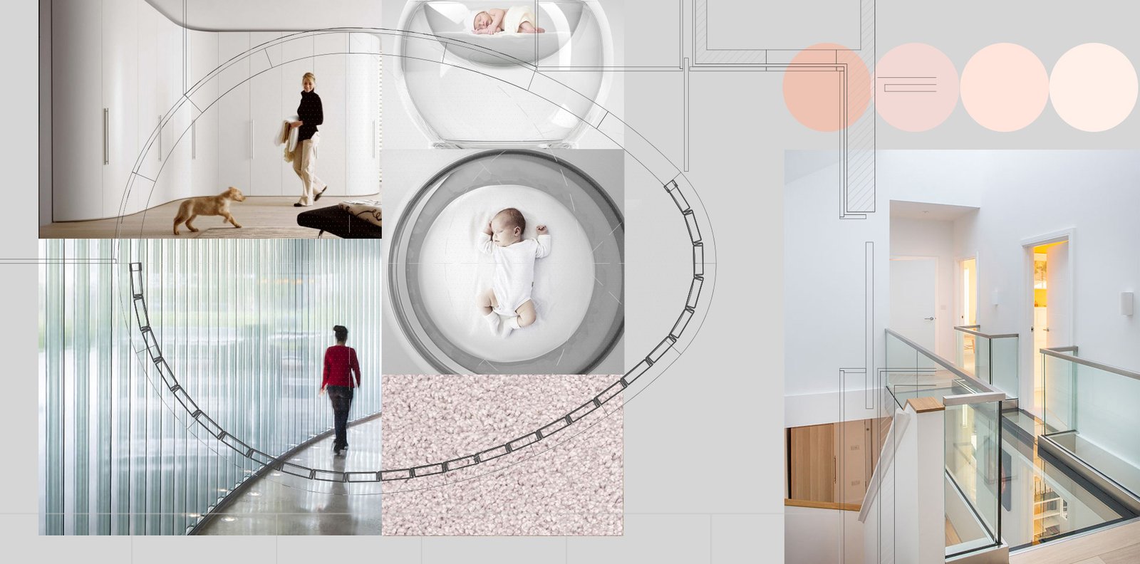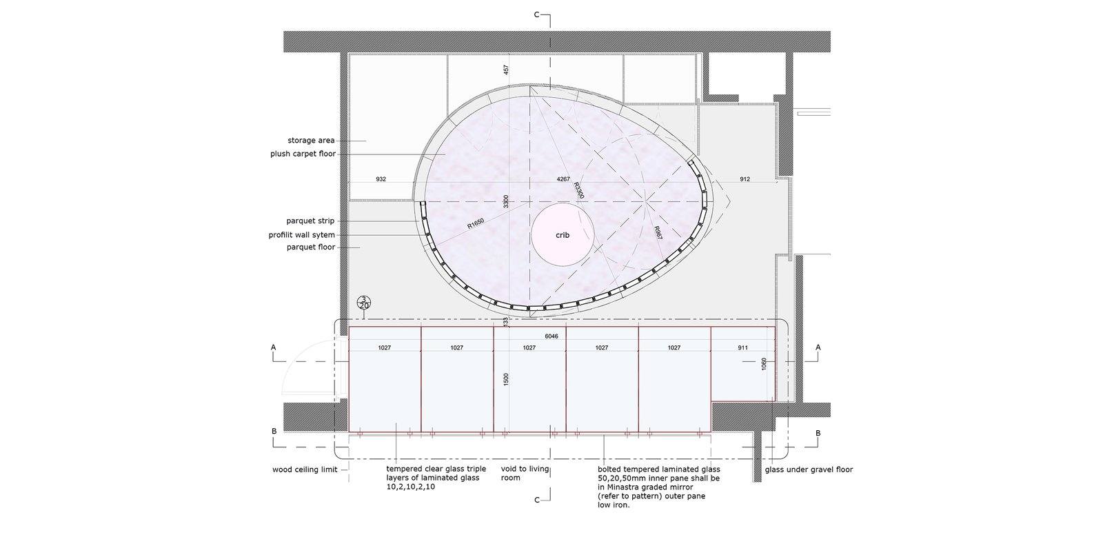 To create a more fluid space for a newborn bedroom, a curving wall is added in the common area of the upper floor of a duplex home in Gemmayzeh. Glass channels animate the space and follow an egg shape curve, thus adding interest to the passage by highlighting the silhouette of people inside and allowing borrowed light to spill out from the living room on to the baby bedroom.