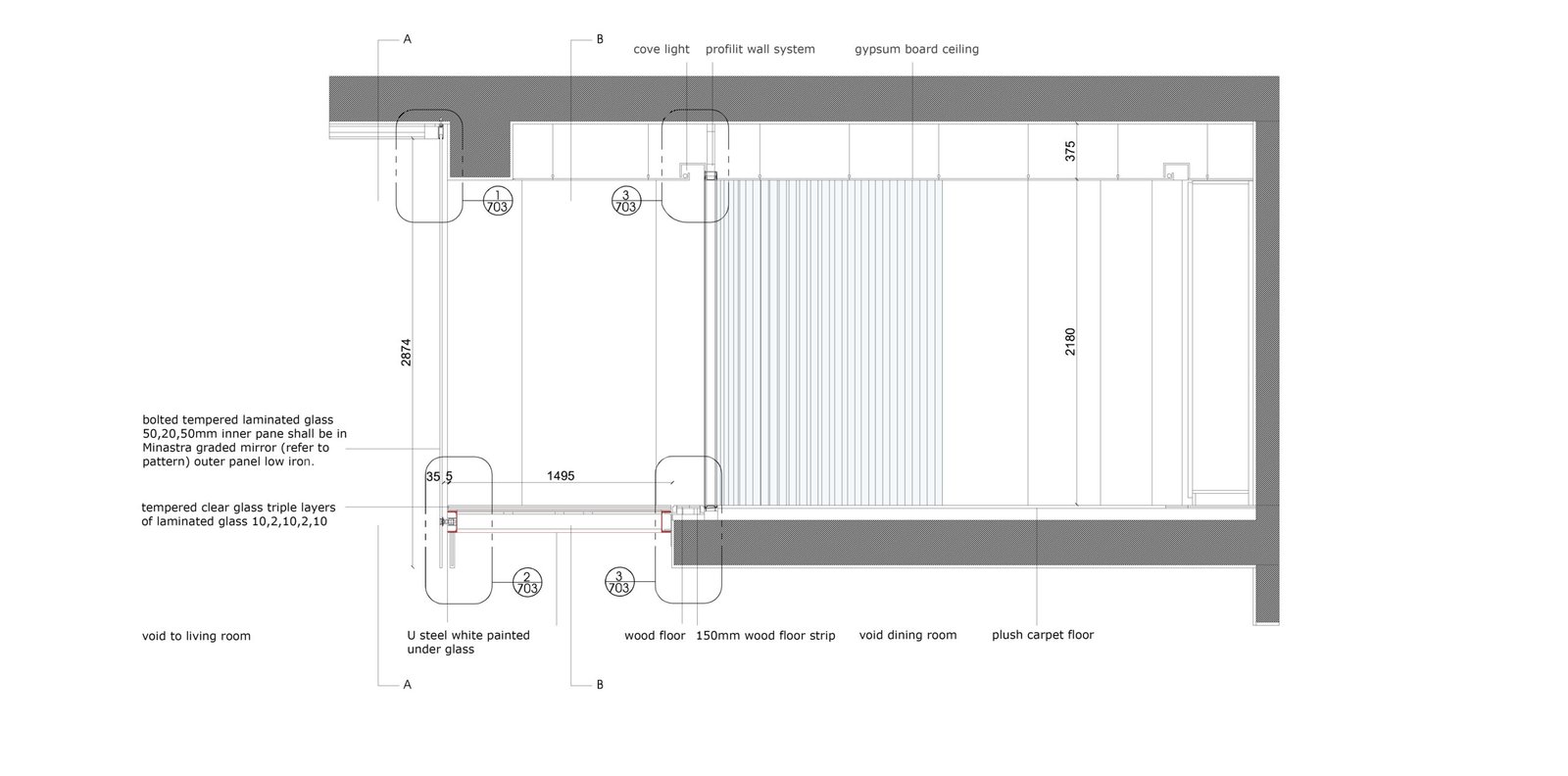 While the outside passage area has wood floors, plush carpet flooring inside the bedroom accentuates the curving wall. Along the baby bedroom a new glass bridge links the two sides of the apartment.