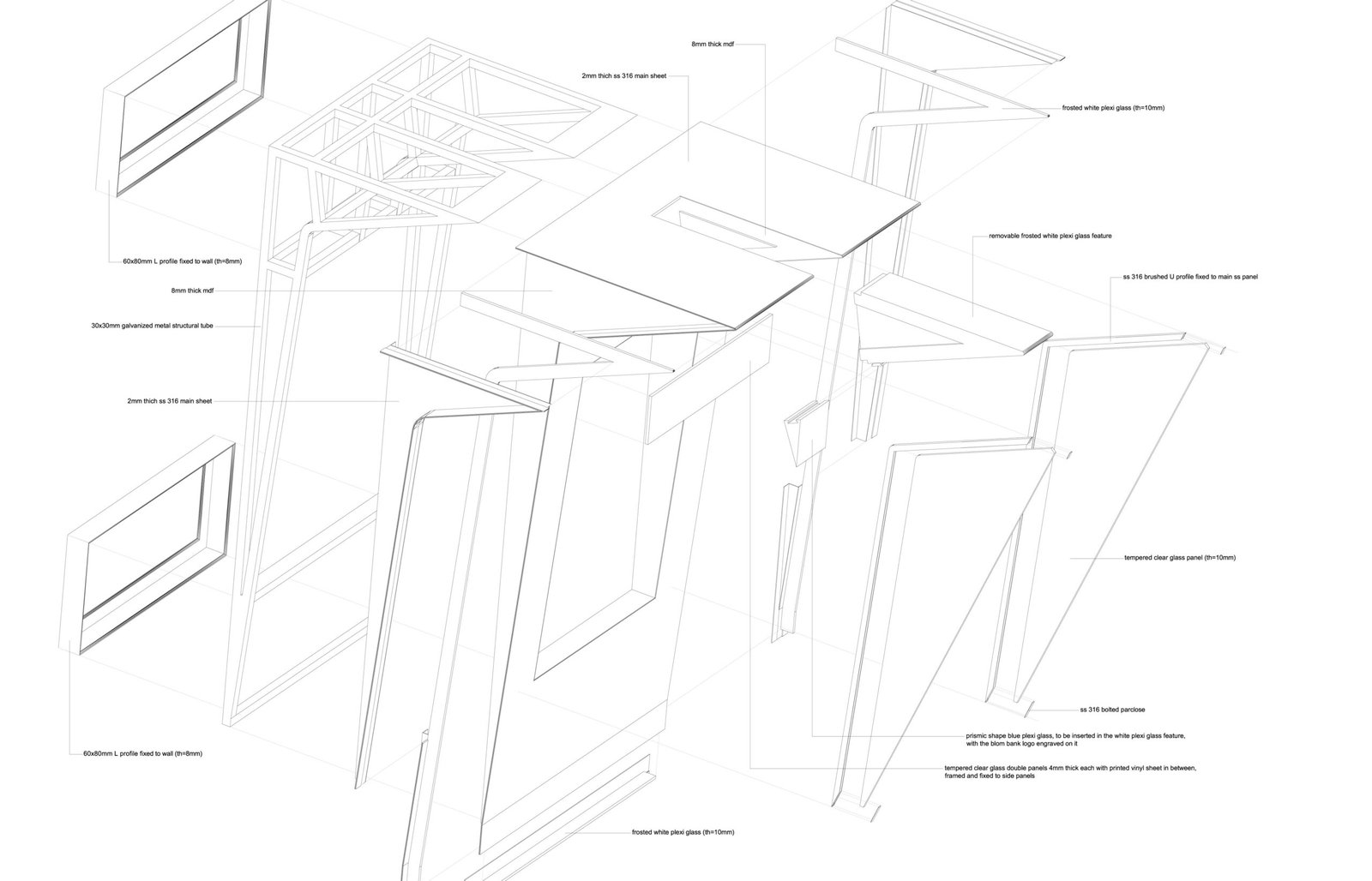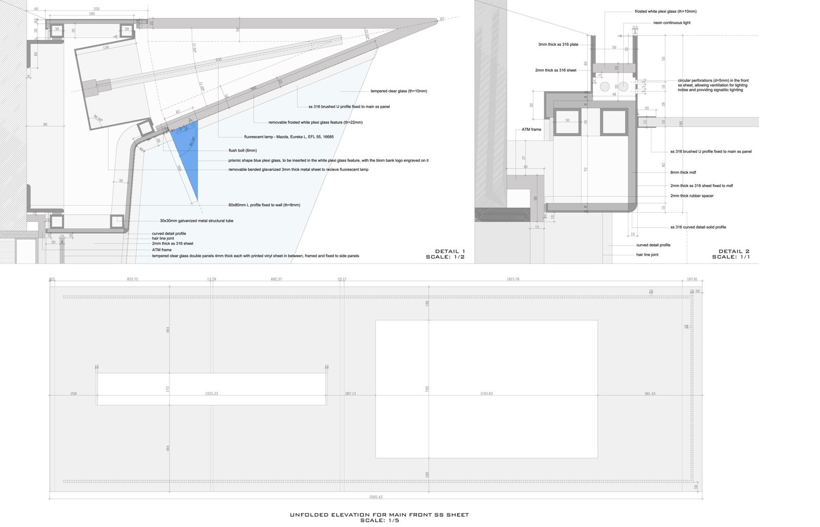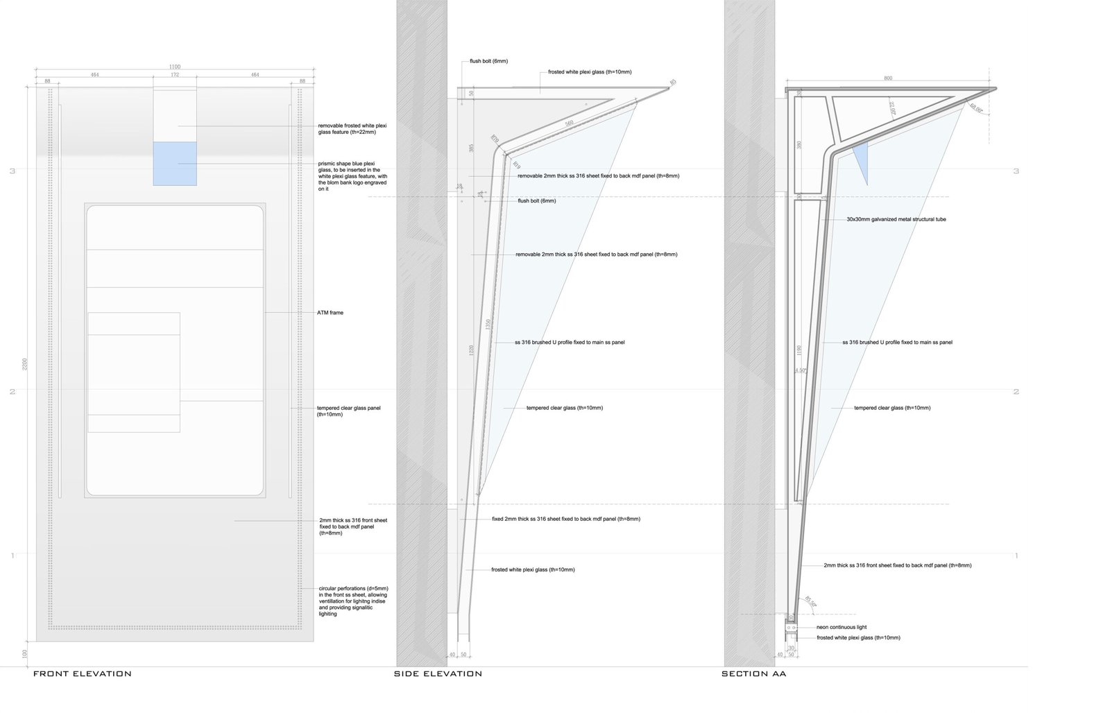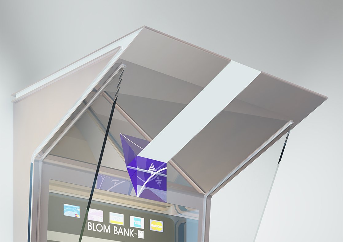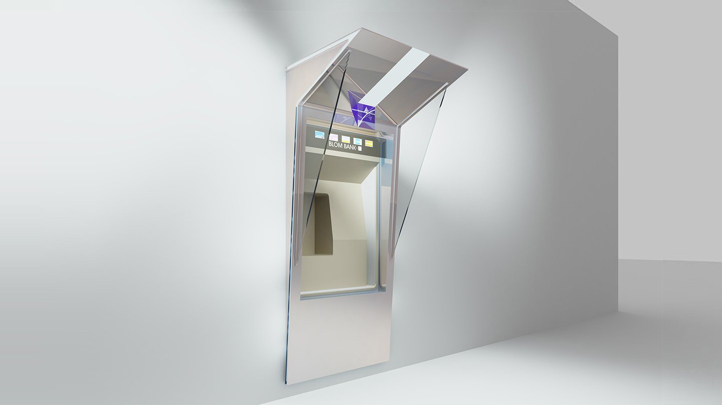 The wall mounted cash dispenser follows the shape of the building. The S.S enclosure has lighting on front canopy, and two strip lights on both canopy sides, making it a highly visible billboard for cash. Two glass side panels provide privacy, without blocking the light.