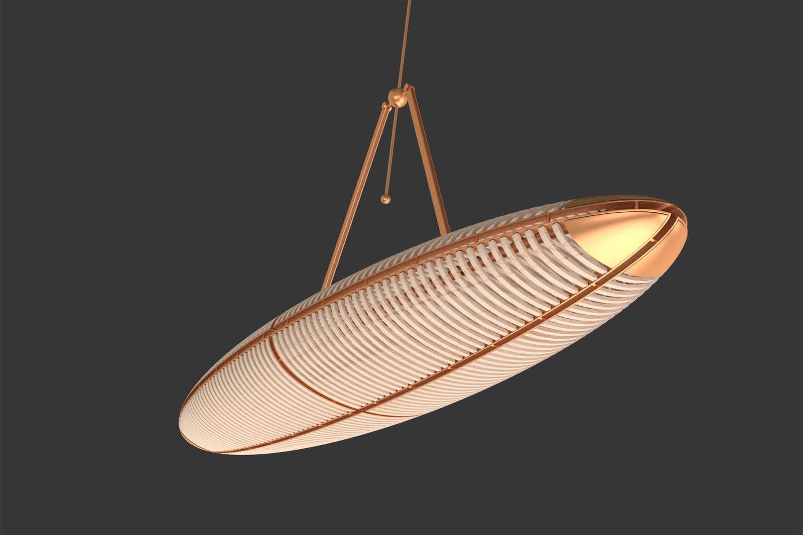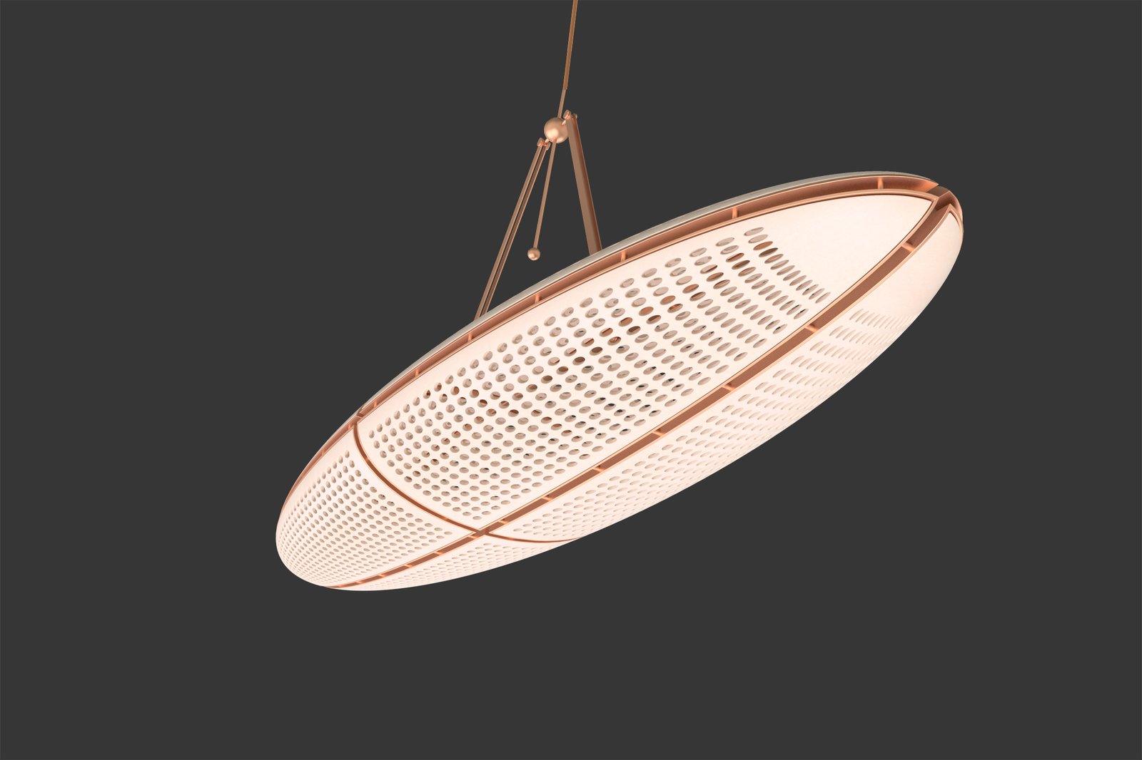 The comet lamp, a modern interpretation of the traditional oriental lantern, is a perforated maple wood ellipsoid divided through its three-axis into eight modular elements connected onto red copper ellipses and suspension.