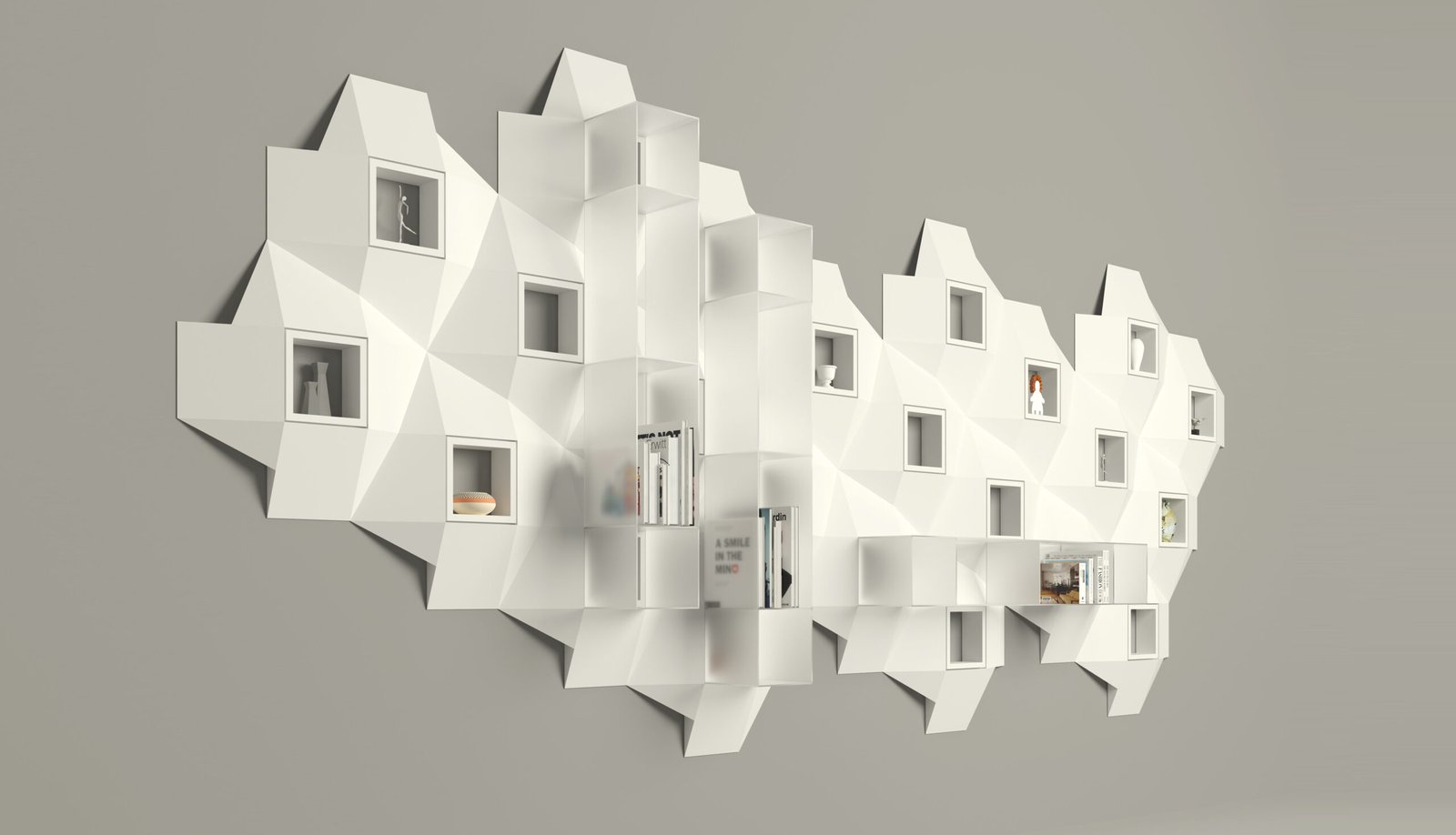The Cross bookcase is a lightweight modular wall display system based on a single geometric cross units that can be combined into different compositional possibilities. For a bit of contrast and additional functionality, white frosted glass displays could be added to the cross composition. A flexible system, the cross bookcase works for private and collective environments: bookcase and product displays.