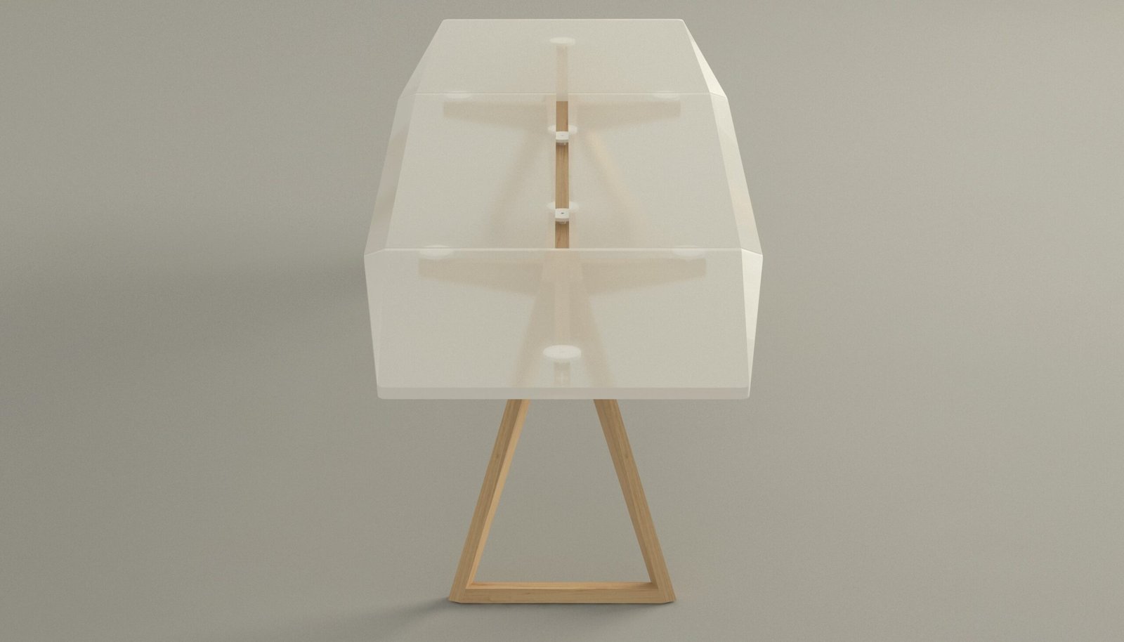 The white table can be combined with two tabletop finishes, white frosted glass or white wooden top, thus enhancing the degree of customization. The white table can be used as a dining table, a desk or a conference table.