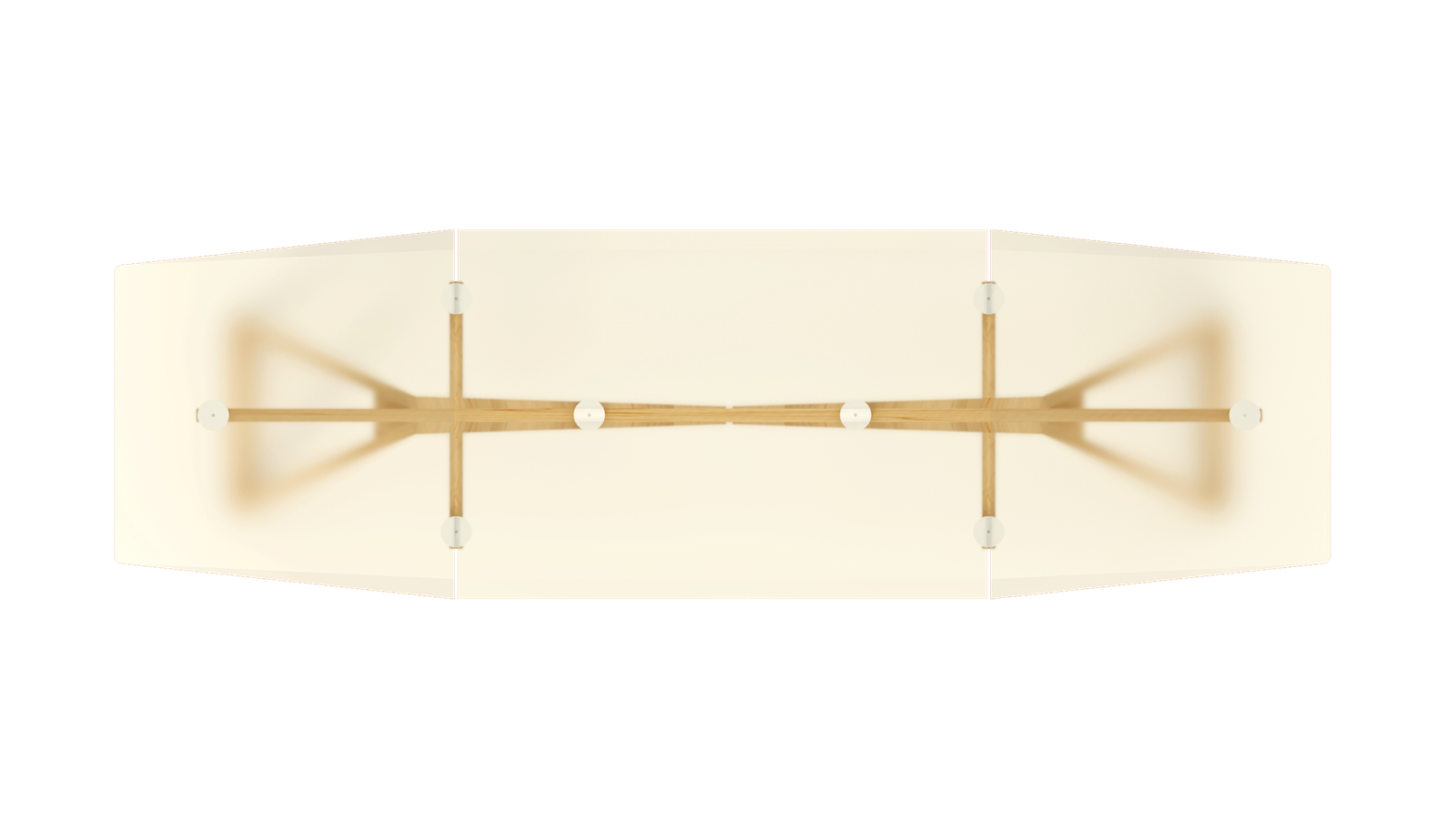 The floating table from white collection has an elegant profile with exposed structure. It is a mix of glass, metal and wood with a sober look. Each element is meant to accomplish a certain function: stainless steel accessories support the glass top while sitting on the wood structure with splayed legs.