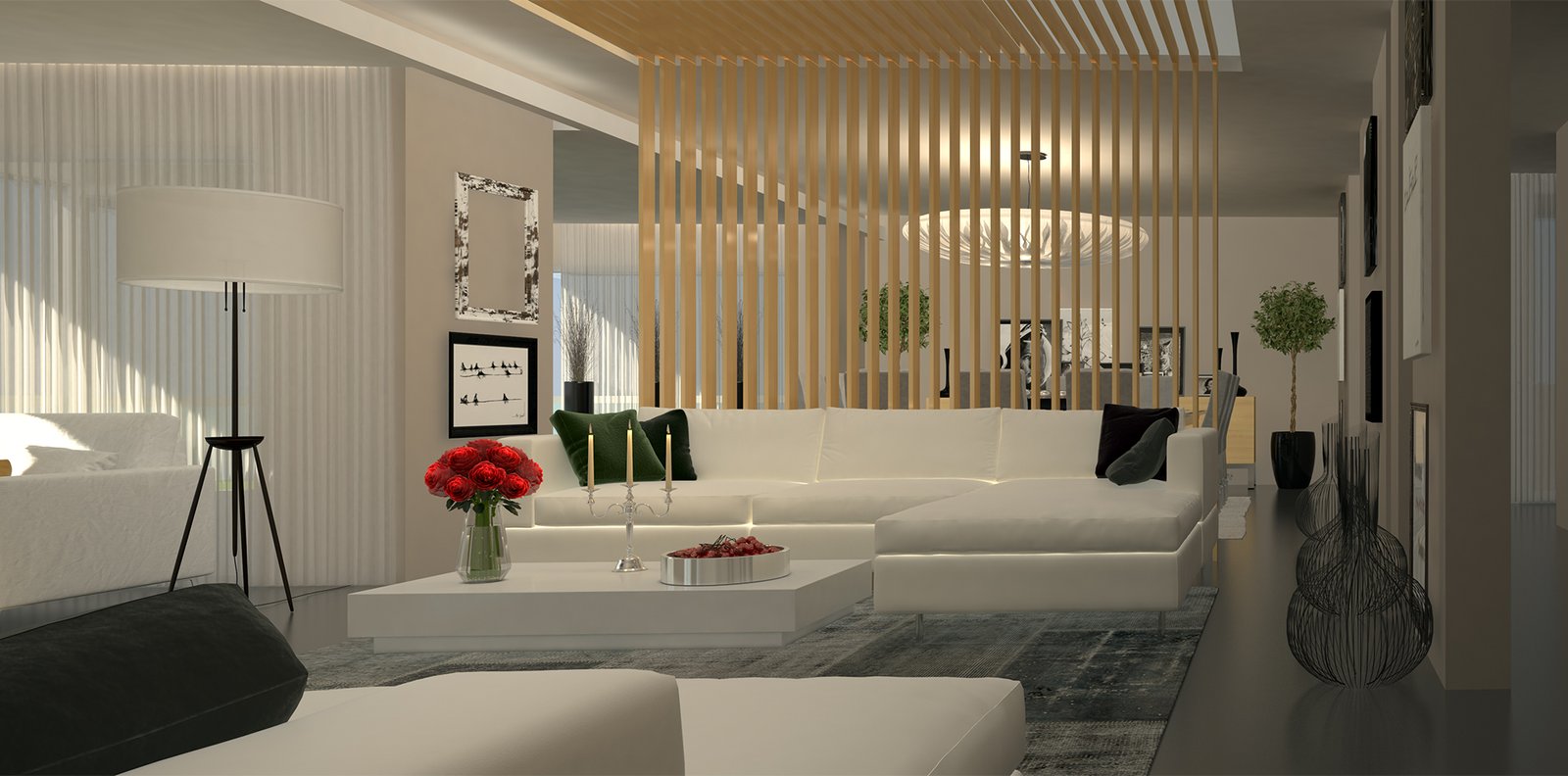 Although the living room is completely open it is defined by a wooden structure that visually divides the space.