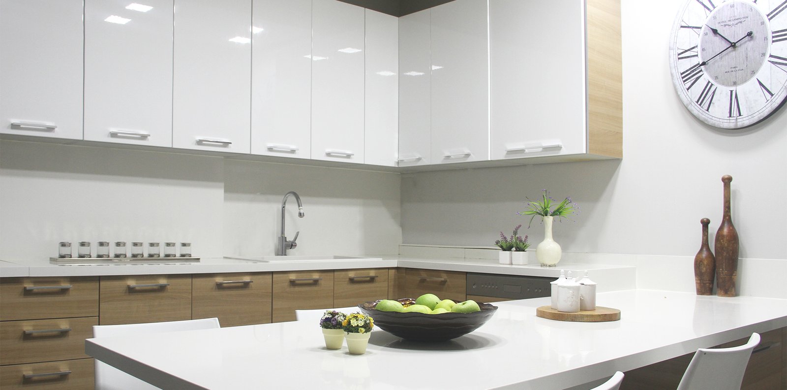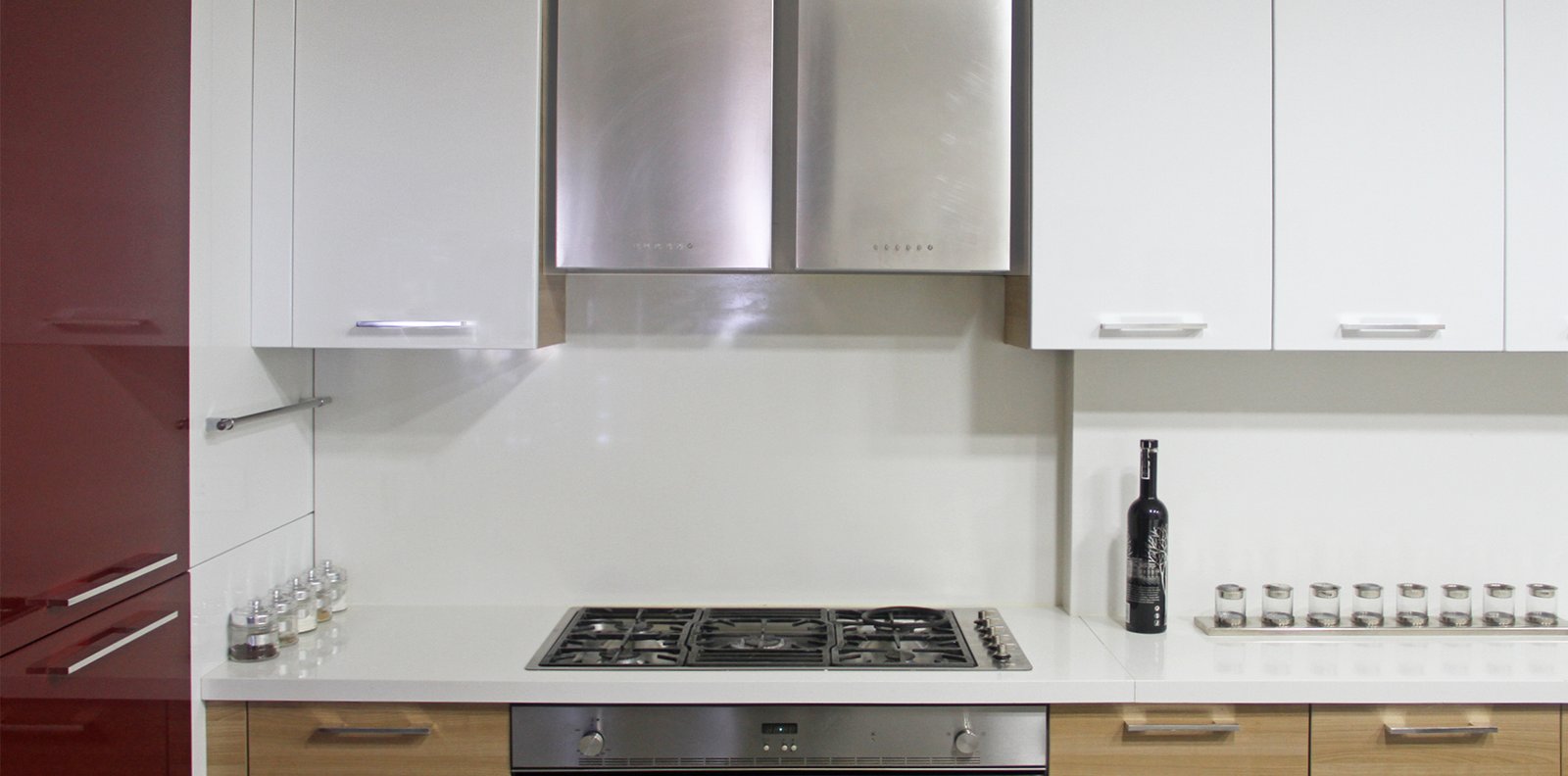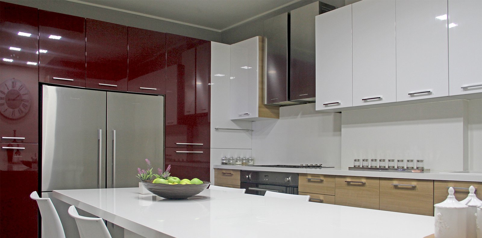 In this classy modern kitchen, warm matte wood lower cabinets play against glossy white lacquer upper cabinets, opposite this compact setup stands a glossy rich red cabinets wall that houses the refrigerator adding spirit to this airy kitchen —white quartz worktop, stainless steel appliances, glossy finishes reflect and bounce the light around the kitchen space.