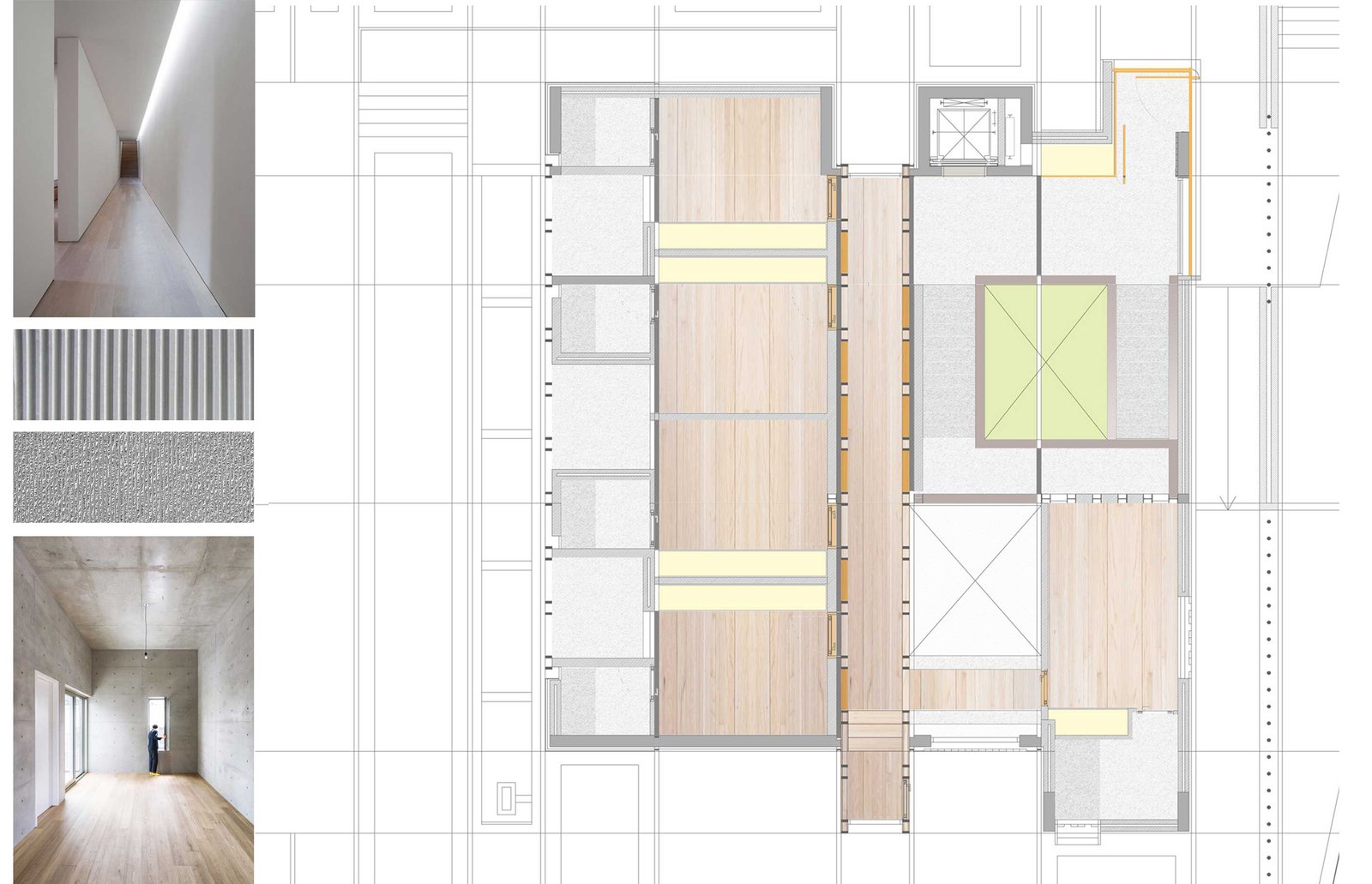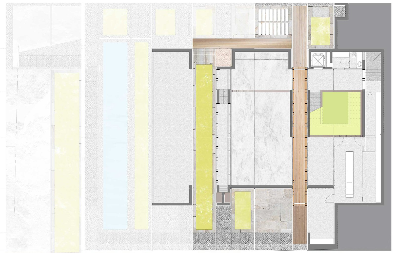 The mountain residence comprises nine blocks of varying heights, each accommodating a different function. These are strategically located for the best views and relationships to one another. Offset blocks follow the contours of the terrain slope stepping down the hill to engage the site and make the house look less massive and integrated into the landscape. Its spaces have a tectonic configuration, sticking to each other like rock crystallisation.The blocks are positioned to maximize natural light on the site, with their irregular positions creating a series of setbacks and protrusions.