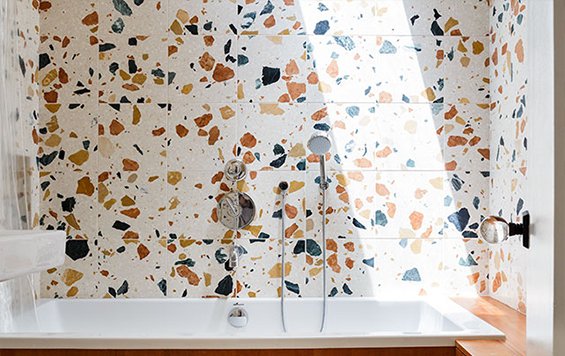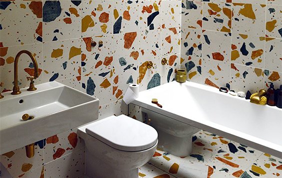 Rather than the small chips of stone embedded in typical terrazzo, large old chunks of marble are included in the mix. Marmoreal combines colored marble with a polyester  binder to create a durable stone, stronger and less porous than natural marble. The final product is mostly natural with a composition of 95% recycled marble and 5% binder. This bathroom in Paris has been covered in  Marmoreal slab.