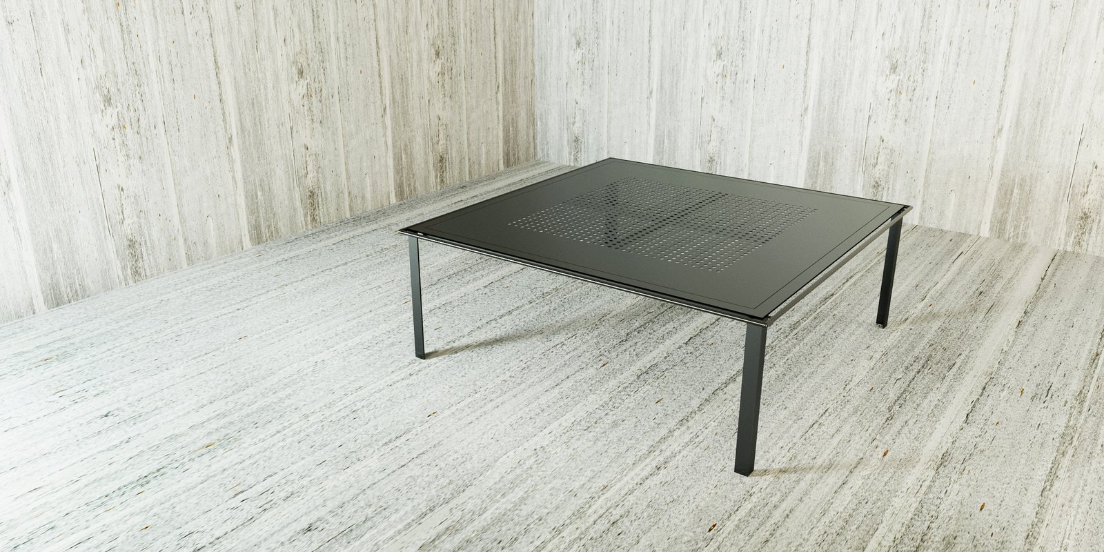 Inspired by industrial materials and processes, the coffee table is made from lacquered solid black steel finished with a glossy powder coating, which is suitable for outdoor use. The top surface of the table has holes perforated in the steel, with legs and frames made from extruded 5-by-5-centimeter L-shaped black steel profiles.